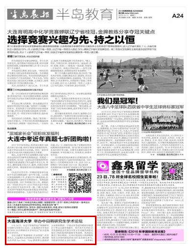 10月11日,《半岛晨报》A24版以“大连海洋大学举办中日韩研究生学术论坛”为题对辽宁省海洋水产领域研究生创新与交流中心主办、探花论坛 承办的“2016中日韩研究生学术论坛”进行了专题报道。
