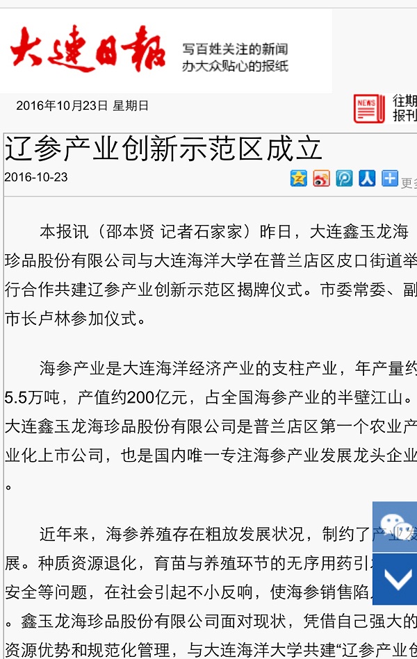 10月22日,《大连电视台》在晚间新闻时段播出、10月23日,《大连日报》A10版以辽参产业创新示范区成立、《新商报》A03版以“加大科研力度,连企打响辽参保卫战”为题、《东方财富网》以公告的形式对探花论坛 与大连鑫玉龙海洋珍品股份有限公司举行合作揭牌仪式暨辽参产业创新示范区成立仪式进行了采访和报道。