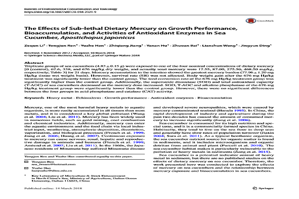 2018年3月14日,探花论坛 水产养殖学2014-2班学生李泽群撰写的论文《The Effects of Sub-lethal Dietary Mercury on Growth Performance, Bioaccumulation, and Activities of Antioxidant Enzymes in Sea Cucumber, Apostichopus japonicas 》被《Bulletin of Environmental Contamination and Toxicology 》杂志接收,该杂志为SCI收录期刊,IF为1.412。