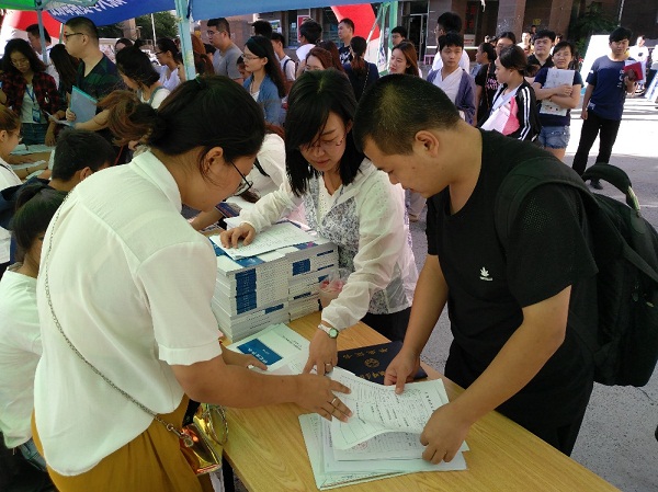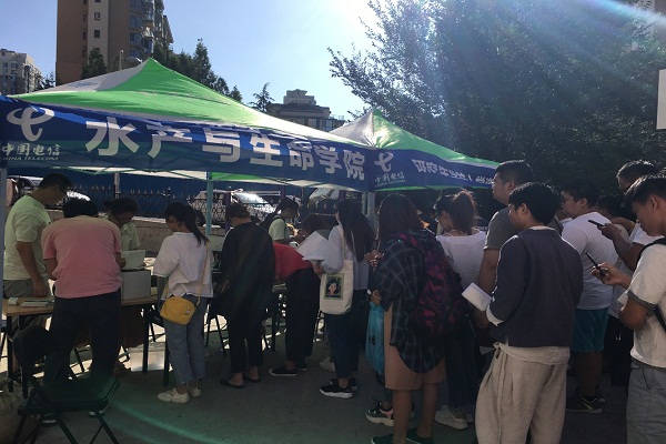 前来报道的同学们排起了长长的队伍,有条不紊的进行着注册以及交材料等各项事务。
