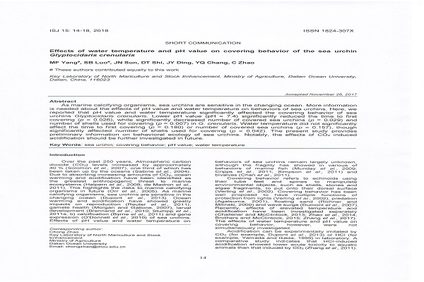 近日,探花论坛 水产养殖专业2015级一班学生杨明芳,在赵冲副研究员的指导下,和同学们共同完成了温度和pH对海刺猬遮蔽行为影响的研究课题,署名第1作者的英文论文“Effects of water temperature and pH value on covering behavior of the sea urchin Glyptocidaris crenularis”于2018年在ISJ - Invertebrate Survival Journal发表,被SCI收录。