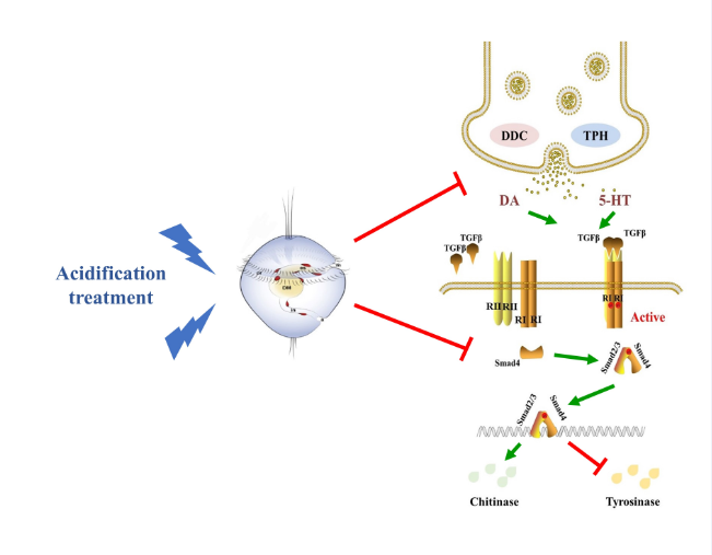 图1. 海洋酸化通过抑制长牡蛎幼虫体内多巴胺和5-羟色胺的合成以及TGF-β smad信号通路的激活,影响早期钙质壳的形成。