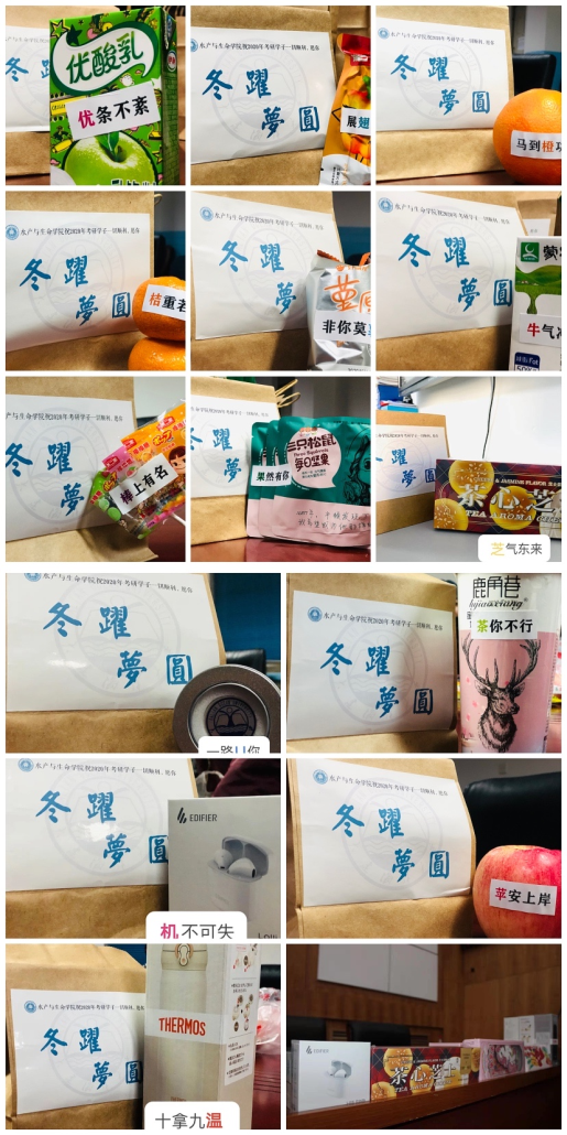 会上,学院领导为考研学子发放“考研专属锦鲤福袋”,并与全体考研学子合影留念。从活动理念、“考研专属锦鲤福袋”的包装的设计与订做、礼品的选择到贺卡的加油文案,历经十余天的时间,经过了几轮方案的修订,注入了探花论坛 老师和学生干部慢慢的期许与祝福,每件礼品都有着一份专属寓意,“苹果”代表“平安上岸”、“橙子”代表“马到成功”、“牛肉干”代表“牛肉冲天”、“奶茶”代表“差你不行”、“棒棒糖”代表“榜上有名”、“薯片”代表“非你莫属”、“鸡翅”代表“展翅高飞”、“果冻”代表“果然有你”。希望同学珍惜最后努力奋斗的日子,展现最优秀的一面,完美通过考试。一份份温暖的礼品让寒冷的冬天充满水产温暖。