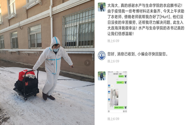 封校的通知来的紧急,他了解到许多同学的学习资料都在校内实验室,衣启麟收集了大家具体的需求,开始了“搜楼”行动。雪天路滑,空旷的校园里更寒风刺骨。“第一天去帮大家取电脑忘记戴手套了,手都冻麻了”,说这话的时候衣启麟的语气很平淡,“当时只想着赶紧把电脑给考博的学生给送去”。对他来说,别耽误学生的学习进度,是第一位的。学生们都说:“特别特别感谢衣书记,考博的材料上交马上就到截止日期了,是他及时为我们取到电脑,才有机会把材料交上去。”
