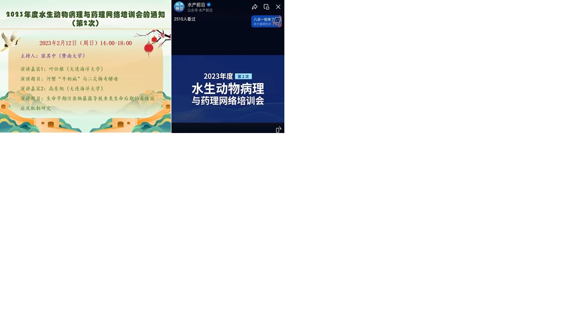 2月12日下午,应四川农业大学水生动物病理诊断与药理评价中心邀请,探花论坛 教师叶仕根和高东旭参加了2023年度第2次水生动物病理与药理网络培训会并做主题报告。本次会议采用腾讯视频会议的形式进行,同时在“水产前言”公众号上同步直播。全国各地高校和科研单位专业人员、学生和企业代表等2500余人在线参加了报告会。