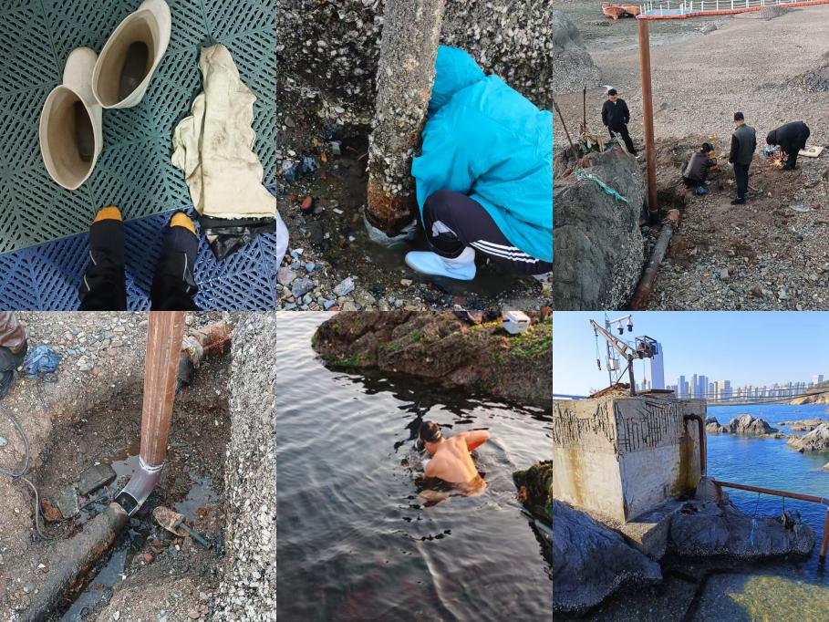 曹淑青老师多次下水,清理吸水管头后也未见好转。月中旬大汛潮期间曹老师凭借多年工作经验,仔细巡检,排查到海上抽水管存在裂口及泵壳锈蚀漏水的问题。然而,维修更换损坏的抽水管需要在退大潮期间很短的时间内方可进行,其难度非同寻常。